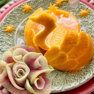 野菜や果物にカービングナイフ1本で、模様を彫刻したり、器を作ったりします。