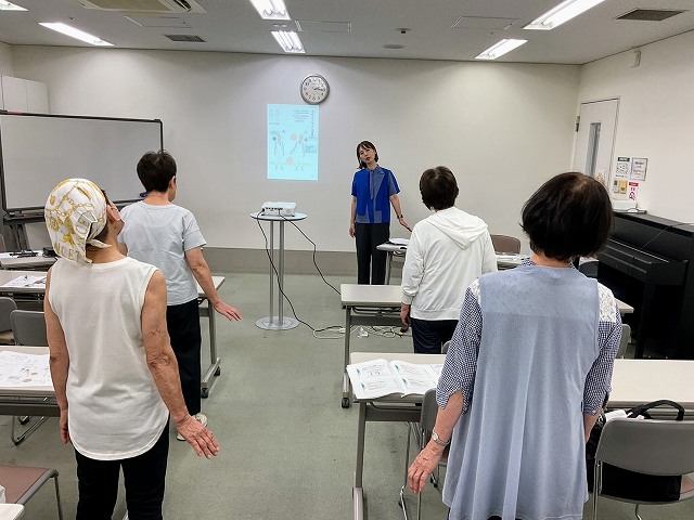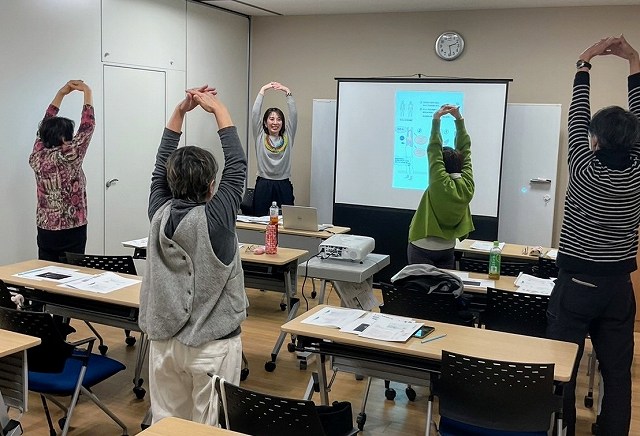 ■講座は座学(スライドを用いたレクチャー)と軽い体操で進めます。椅子に座って講義を聞いていただき、その場で軽く身体を動かします。