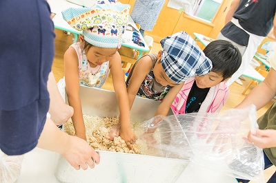 創業1914年(大正3年)の福井県の老舗味噌蔵マルカワみそによる手作り味噌教室。講師は福井県最年少でみそ一級技能士合格(国家資格である技能検定制度)の河崎紘徳先生。原料は、国産有機大豆、国産有機栽培の白米麹、玄米麹、豆麹、麦麹、そして自然塩の天日湖塩で仕込みます。