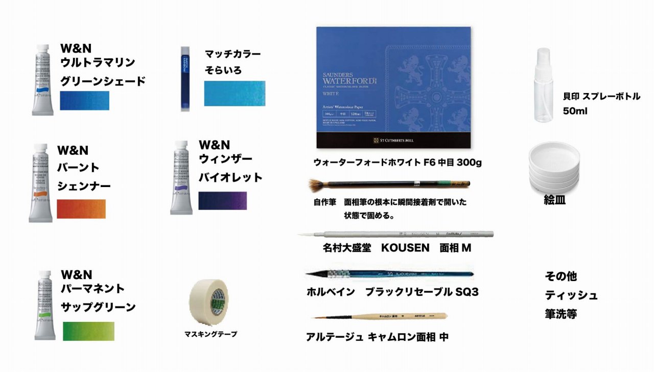 W&N(ウルトラマリングリーンシェード バーントシェンナー パーマネントサップグリーン ウィンザーバイオレット)マッチカラー(そらいろ)マスキングテープ ウォーターフォードホワイトF6中目300g 自作筆(面相筆の根本に瞬間接着剤で開いた状態で固める) 名村大盛堂KOUSEN面相M ホルベインブラックリセーブルSQ3アルテージュキャムロン面相中 貝印スプレーボトル50ml 絵皿ティッシュ※筆洗は備付あり。