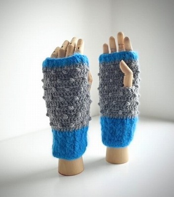 かぎ針で小さなつぶつぶ模様を編み、ウールとモヘア毛糸でバイカラーのハンドウォーマーを作ります。