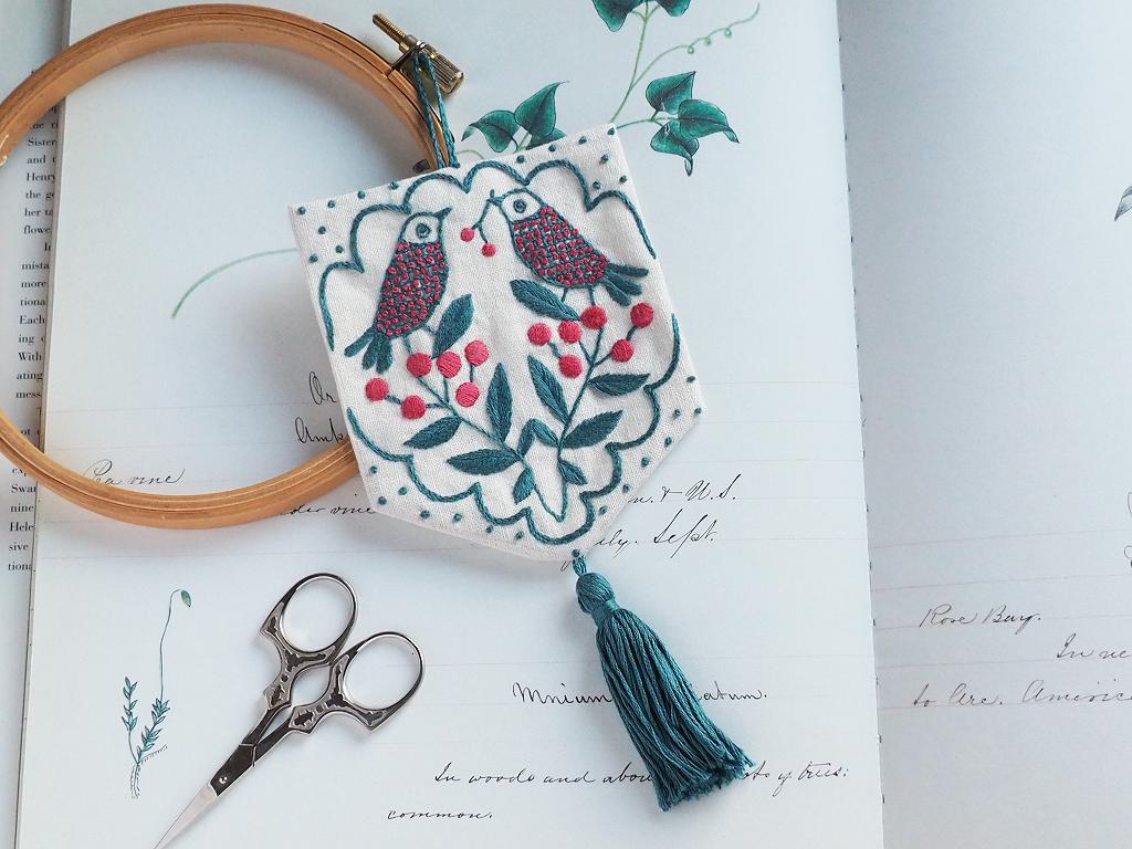 シンメトリーの小鳥と植物の図案を刺繍して壁飾りに仕立てます。
