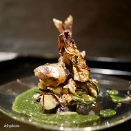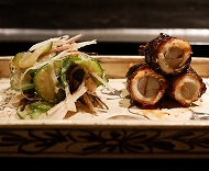 祇園新橋に近い雑居ビル。目立った看板はない。店主は大学で建築を学ぶうちに木造建築や茶道に魅せられて料理の道へ入った異色の経歴。食材は、京都・近畿内を中心に厳選し仕入れている。客の心と記憶に残るよう、定番メニューしかり季節ごとのメニュー等は予約時の確認によって食材・料理法などを考えながら組み立てているそう。店内はカウンター8席のみの落ち着いた空間。料理を美しく引立たせる器や小物は、店主が買い揃えた骨董や現代作家の陶磁器・漆器・ガラスなど。料理は一人でこなすため、時間に余裕を。こだわりの器で演出される料理を心ゆくまでご堪能下さい。開業12年の人気店