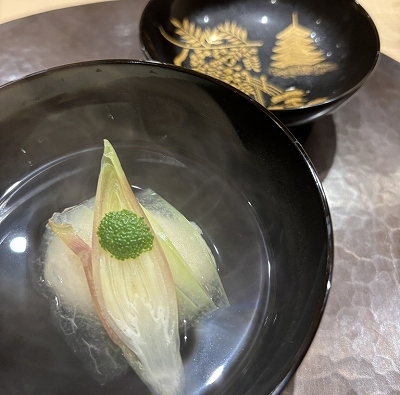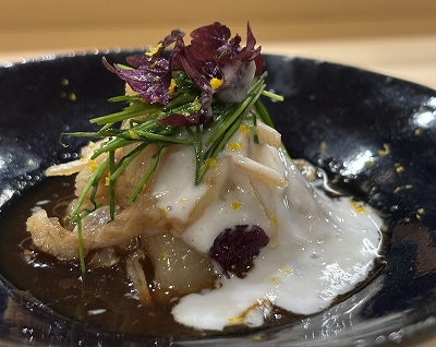 店主は、江戸時代から続く“関西料理”を現代に伝える長堀橋の名店「梅市」で10年腕を磨いた料理人。味を引き継ぎ、伝統的な技法で素材本来の持ち味を引き出した料理は、素朴でありながらも四季の移ろいを感じさせる奥深い味わい。特にこだわっているのは、日本料理の真髄ともいえる“出汁”。北海道産昆布と特注の鰹節から丁寧に引いた出汁が、コースに盛り込む一品一品の豊かな味わいと香りを引き立てる。料理を彩る器や酒器も、店主が自ら選んだもの。趣向を凝らした品々と共に、全国各地より厳選した銘酒も。店内は和の趣漂う落ち着いた空間。カウンター8席のみ