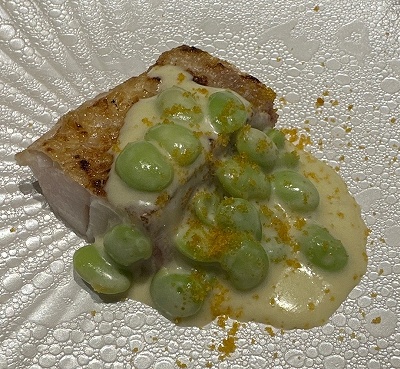 シェフは1994年 兵庫県生まれ。 高校卒業後、大学に通いながら名古屋の高級イタリアンで2年間、卒業後は数々のホテルやレストランでフレンチの腕を磨き、大阪・福島区のミシュラン掲載店「il luogo di TAKEUCHI」で2年間研鑽を積む。2020年には世界初のルイヴィトンとのコラボレーションレストラン「SUGALABO V」スーシェフに就任。2023年1月に大阪・北新地に独立様々なジャンルの料理を使いこなす新進気鋭の料理人。 型やベースが一切無く、食材の持つ可能性を最大限に引き出し、本質的な美味しさを徹底的に追求した料理を、軽快なトークと共に楽める。通常は夜の2部制のところを、無理を言って昼にも開けたいただいた。