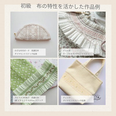 スモッキング刺繍帯びを縫い合わせるコツやポーチへの仕立て方も学びます。