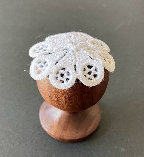 ピンクッションの土台は、木工房<結>の高級感あるウォールナット素材のエッグスタンドです。