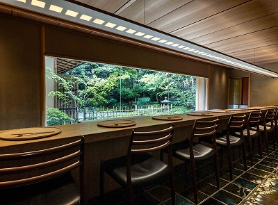 四条通から一歩足を踏み入れた小路に、カウンター8席と個室で構成された二ツ星「緒方」の主人・緒方俊郎氏が若手にも活躍の場を与えたいと2021年秋、岡崎に出店した「東山緒方」。ここでは、月に4回度だけ、緒方敏郎氏が本店と同じ料理に腕を振るいます。今回はその回です。『和久傳』で総料理長を務めた緒方氏は、丹波の松茸、間人のカニ、京野菜をはじめとした選りすぐりの素材を大胆かつ繊細に落とし込んだ珠玉のひと皿から、移り変わる京の四季が感じられる究極の割烹懐石です。カウンター席からの眺めもいいので、同じ内容なら東山もお勧め(本店は紹介制)
