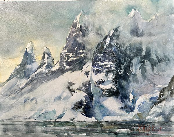 今回は、紙の白を最大限に生かして、雄大な雪山と初夏の雪解け大滝を描きます。