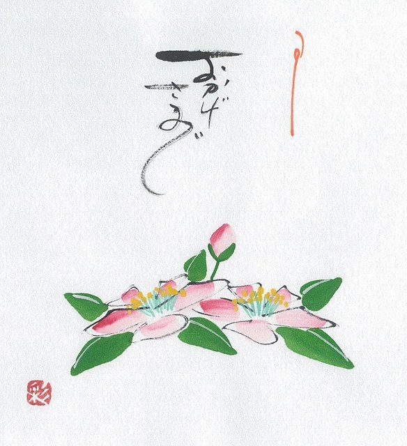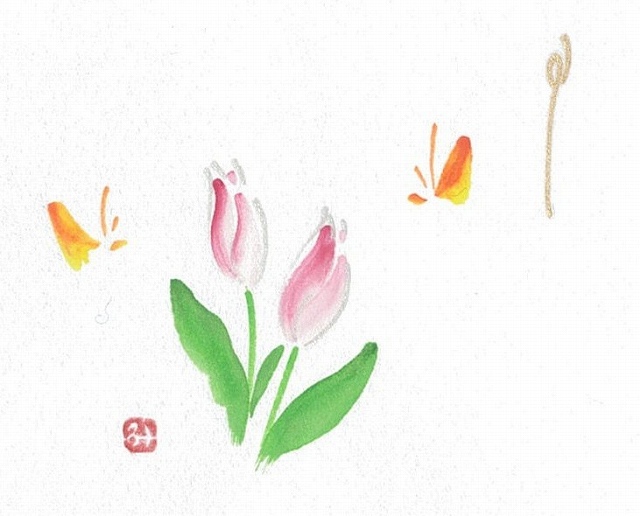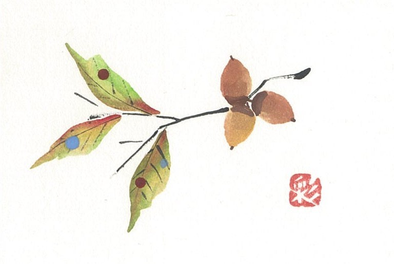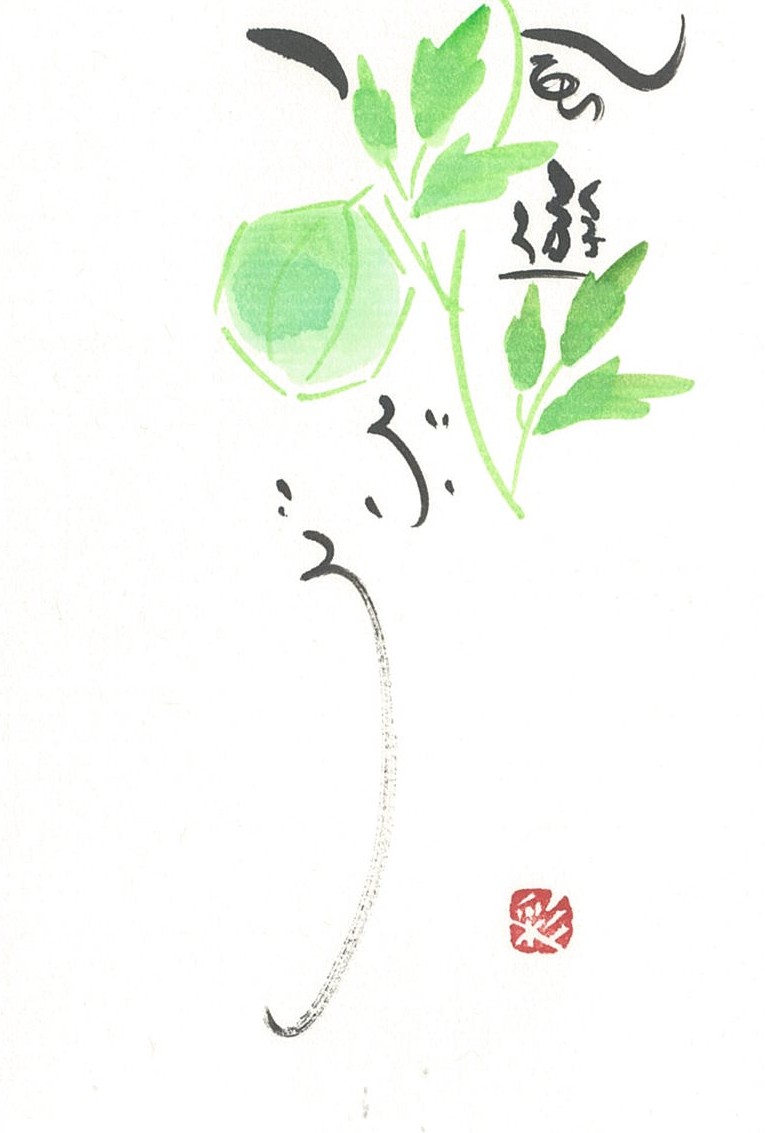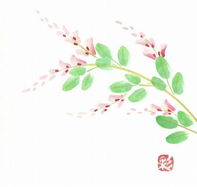 はがきの片すみや贈り物ののし紙などに、手描きの草花をひと筆で描きます。ほんのちょっとの時間と紙、水、顔彩(絵の具)だけで、心なごむひとときが得られます。