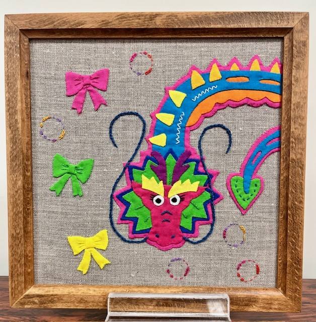 赤、青、オレンジなど鮮やかな色彩の布で作り出す太陽、動植物などをモチーフにした図柄は、とても楽しいものです。作品はタペストリー、額、クッションなどに仕上げることができます。