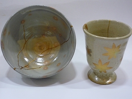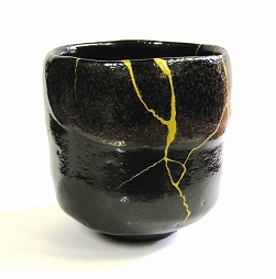 「金繕い」や「金直し」ともいい、割れた部分を継ぎ、欠けた部分を形成しその部分に金銀の化粧を施し器を修繕する技法です。
